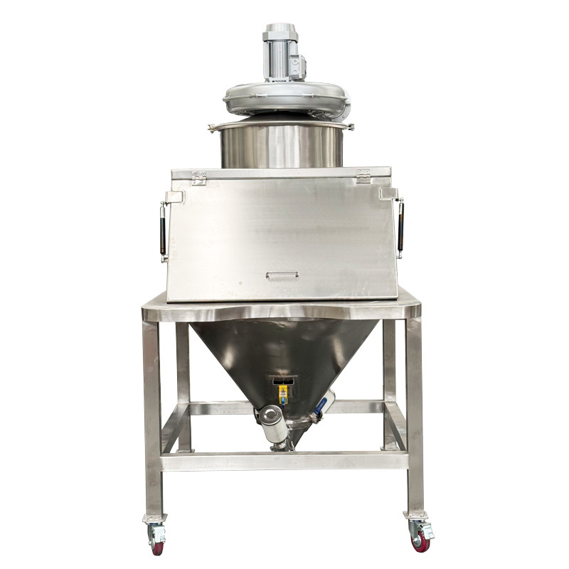 The dust-free feeding station operates based on the core principle of "sealing isolation + negative pressure suction": The sealed chamber is precisely aligned with the feeding port to prevent dust from spilling out;At the same time, it can prevent the blockage of the feeding port by vibration to break the arch, and also integrate the synchronous screening and debris removal function of the screen, which can be adapted to various material bags and help achieve clean feeding of dust-prone materials.