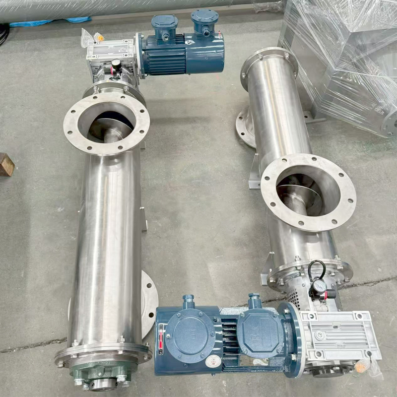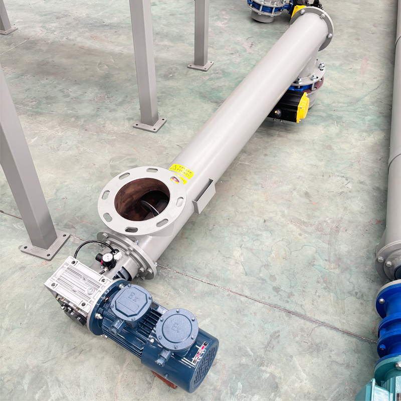 1. Шнековый конвейер транспортирует смешанный материал из ленточного смесителя к горизонтальному шнековому конвейеру